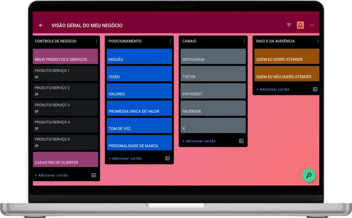 Quadro no Trello para organização de conteúdo e gestão de negócio;